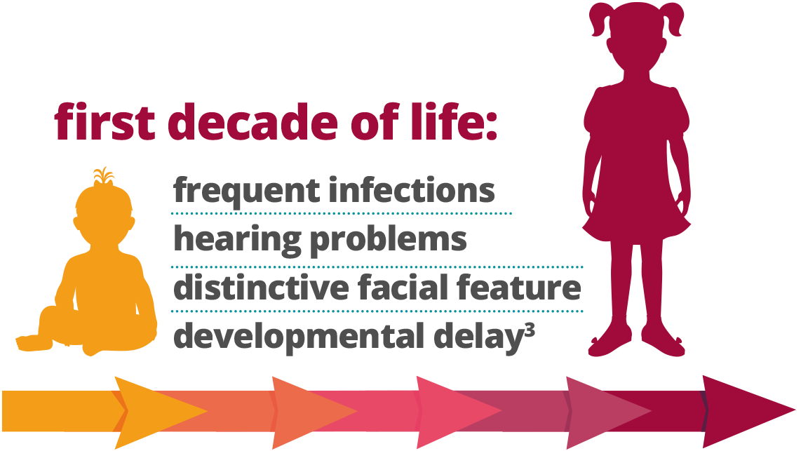 During the first decade of life, a child with the condition may have frequent infections, hearing problems, distinctive facial features and developmental delay.3